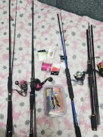 왼쪽에있는거 2개는 깨끗합니다 오른쪽두개는 망가진낚시대지만 사용가능합니다 그리고 가운데 있는거 도 포함으로 다드립니다 바로 낚시 가능 네고는 최대 5만가능합니다 많이 찔러주세요 낚시대 케이스4개는 서비스 입니다 망가진낚시대는 맨 마지막사진에 잘 나와있어요