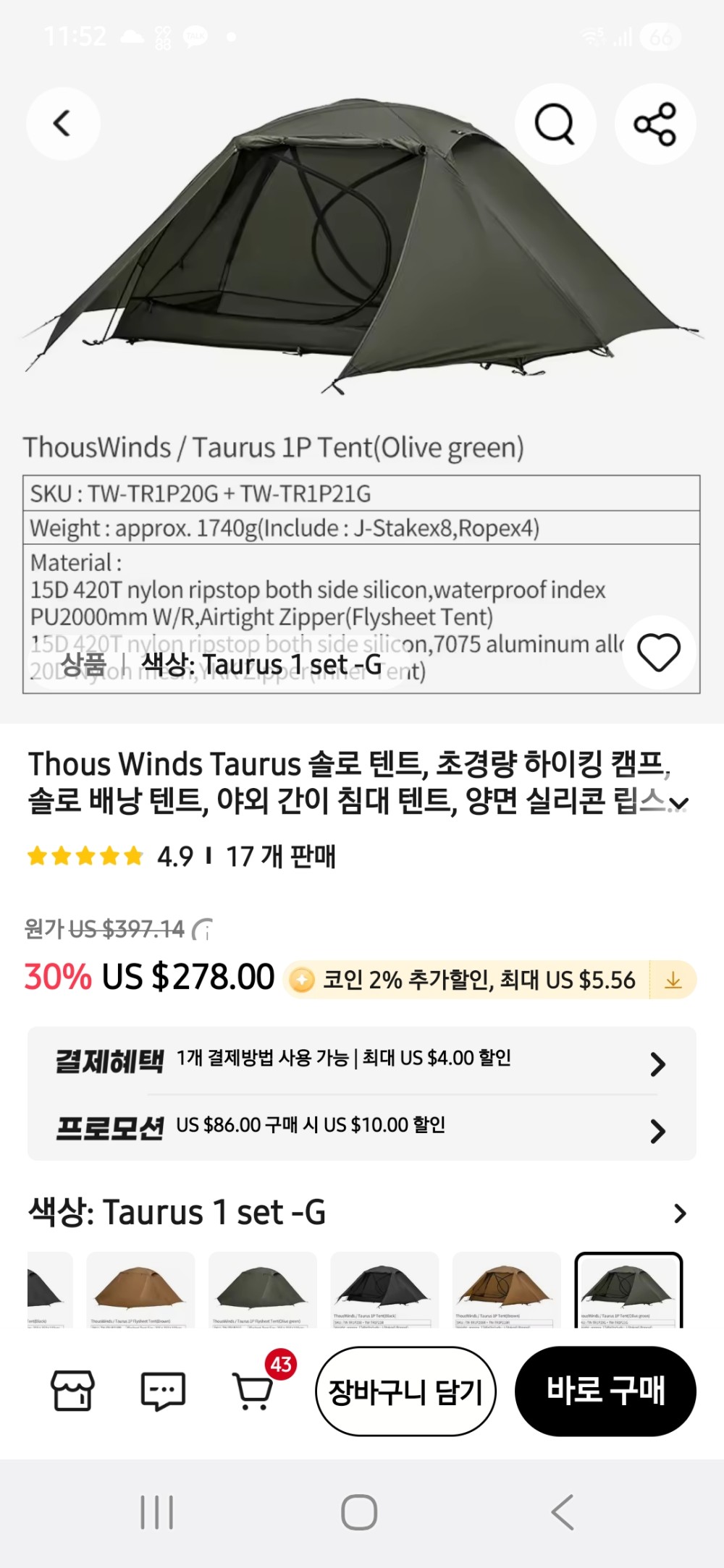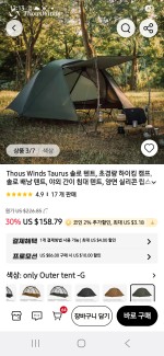 3.제품의 자세한내용은 알리익스프레스에서 THOUS WINDS TAURUS 솔로텐트 치면나옵니다.중국제품이라 가격이 이정도지만 품질은 최고입니다.